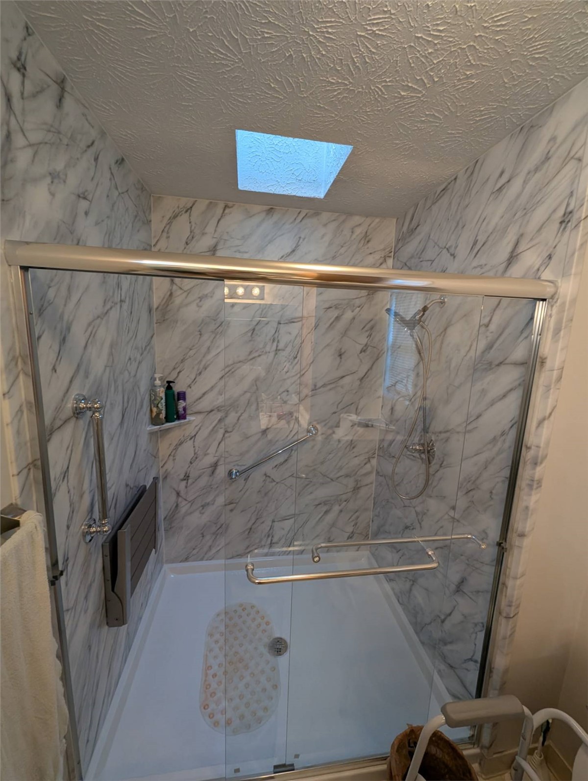 - Challenge: corner shower by a window requiring a custom swing door between two fixed panels