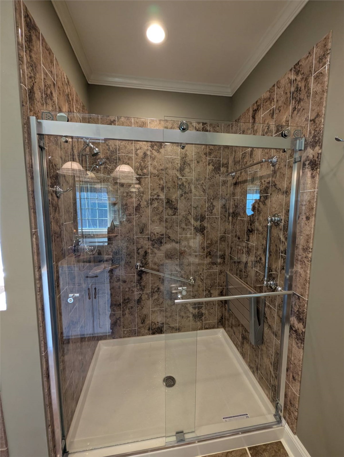 - Scope: design, demolition, porcelain tile installation, custom frameless glass door, glass-to-glass hinges